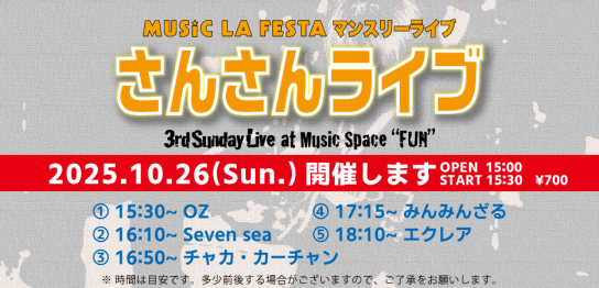 今月の26日(日)は、さんさんライブを開催します! 出演は、全5グループ。 ロックユニット、バンド、弾語りなど色々なジャンルが楽しめる1日になると思いま >>>